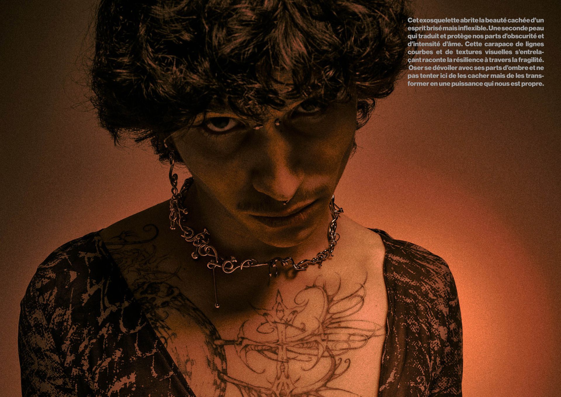 Cet exosquelette abrite la beauté cachée d’un esprit brisé mais inflexible. Une seconde peau qui traduit et protège nos parts d’obscurité et d’intensité d’âme. Cette carapace de lignes courbes et de textures visuelles s’entrelaçant raconte la résilience à travers la fragilité. Oser se dévoiler avec ses parts d’ombre et ne pas tenter ici de les cacher mais de les transformer en une puissance qui nous est propre.
